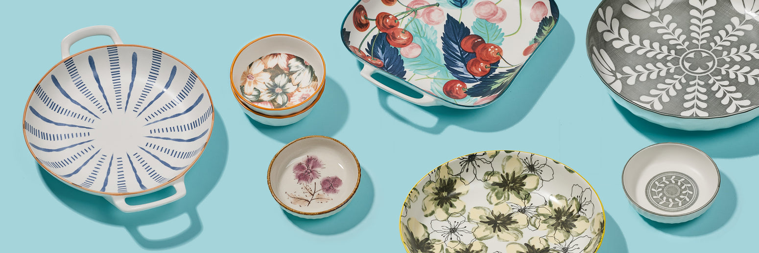 Cherry and Feather Print Ceramic Serving Set with Teal Rim