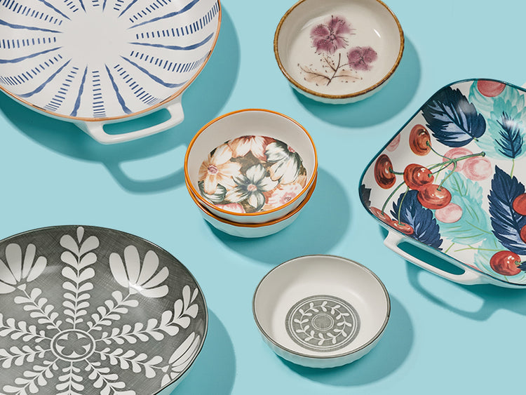 "Cherry and Feather Print Ceramic Serving Set with Teal Rim